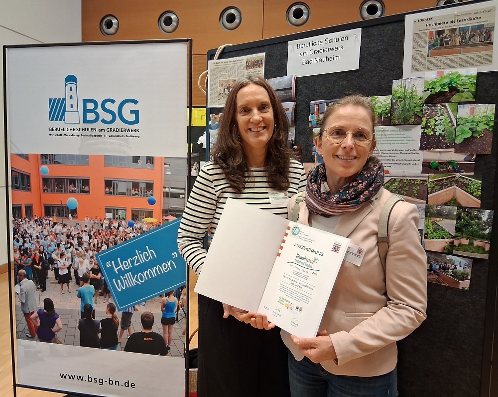 Für beide Projekte erhielten die Beruflichen Schulen am Gradierwerk jetzt die Auszeichnung „Hessische Umweltschule – Lernen und Handeln für unsere Zukunft“ von gleich zwei Hessischen Ministerien, dem Kultusministerium und dem Umweltministerium. Die Auszeichnung wird für zwei Jahre verliehen mit dem Ziel, die Unterrichtsqualität und das Schulleben im Sinne einer Bildung für nachhaltige Entwicklung zu verbessern. 2021 wurden die Hessischen Umweltschulen vom Bundesbildungsministerium und der UNESCO als hervorragende Bildungsinitiativen für nachhaltige Entwicklung ausgezeichnet.